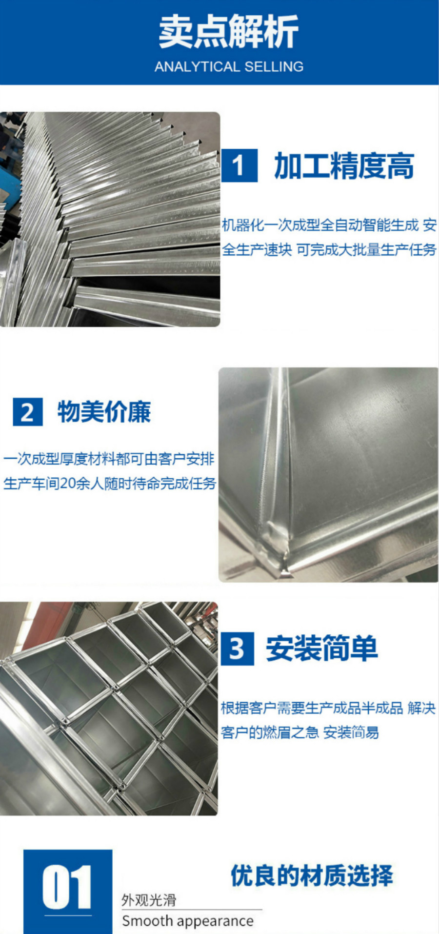 4、除塵共板式法蘭風管又稱法蘭風管,主要由角碼、法蘭夾及與風管一體相連的法蘭連接,通過機床進行加工,這種形式風管造價較低(減少了角鋼用量,減少了制作角鋼法蘭的人工用量)。其制作形式比傳統的矩形風管加工速度更快捷、安裝更方便、更小的漏風率。其優點是節省材料,減少工程投資; 漏風量小,降低能耗,節省運行費用,頗受施工企業歡迎。鍍鋅共板法蘭風管是目前空調工程、通風管道排(pai)煙系統(tong)中應用較廣(guang)泛。